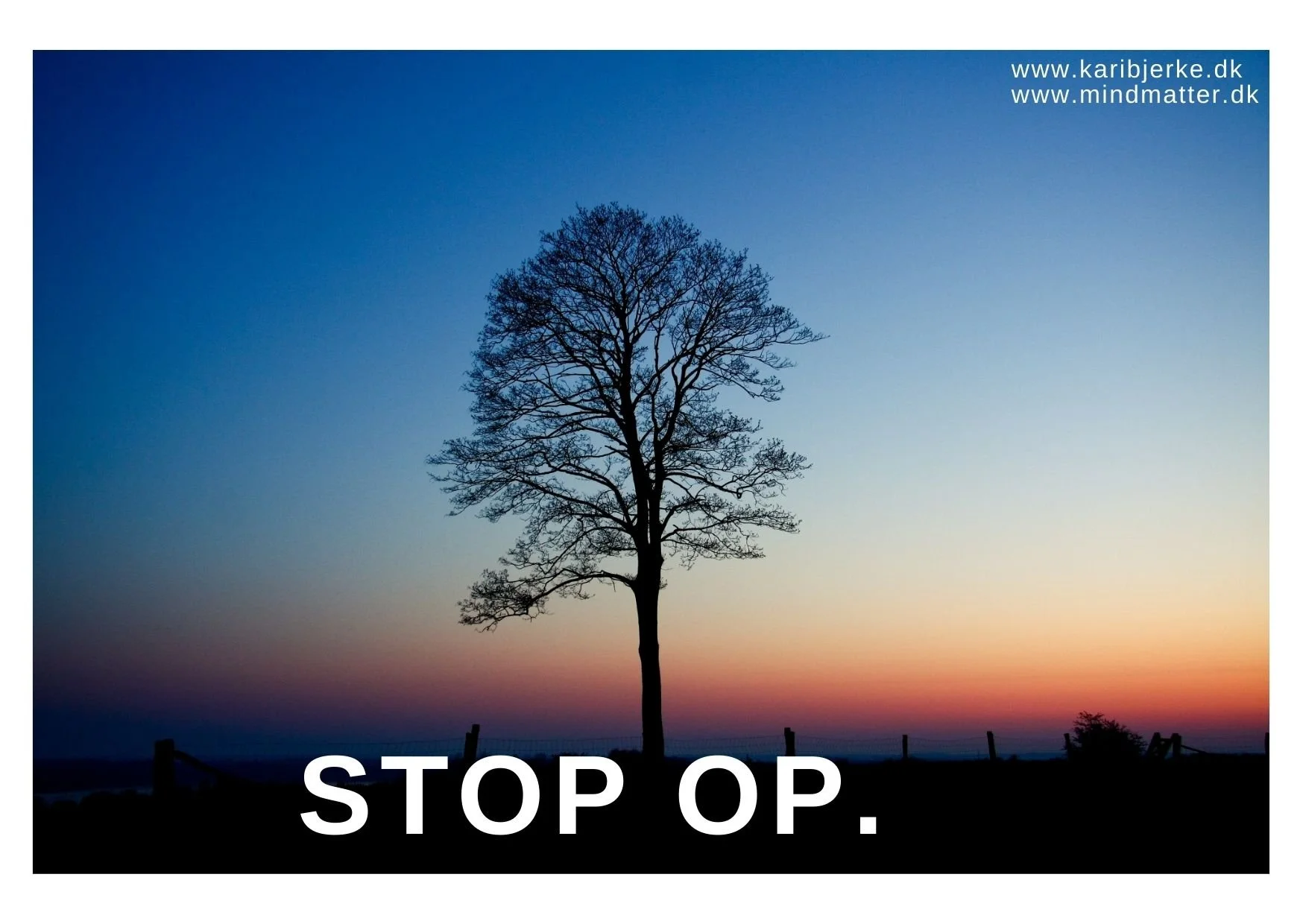 Og tænk at være så heldig at arbejde med noget, som hjælper mig selv. Jeg tilbyder bla. kurser med værktøjer i at STOPPE Op. Efter sådan en kursusdag er jeg selv fyldt op af ro, tilfredshed og en afslappet følelse i krop og sind. Denne ro kan vi alle komme i kontakt med, når vi prioriterer at STOPPE OS SELV ved at bruge tid på at mærke kroppen og tage sig af sin mentale sundhed. Har du selv tænkt over, hvornår og hvordan stopper du op?